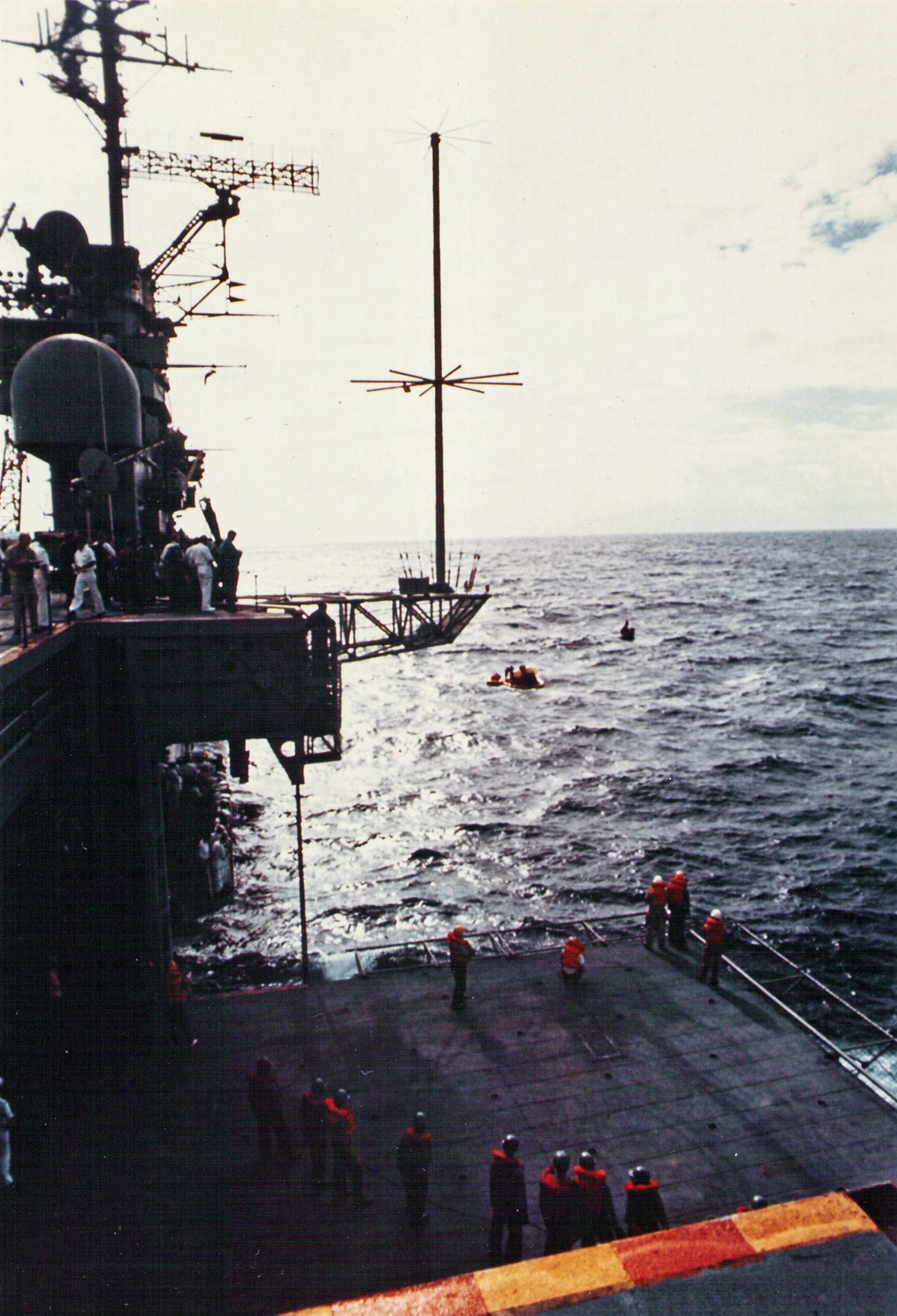 899k | A nice helicopter photo of Yankee Clipper just as it was lifted from the ocean by Hornet's B&A crane. On the flight deck is the astronaut recovery helicopter #66. Just in front of it is the stand from which a TV camera is broadcasting live images around the world via the satellite antenna (just a portion of its dome can be seen on the far right). Beneath the B&A crane in the raft are the UDT-13 swimmers, preparing to board the ship by climbing up a cargo net. On the far right of elevator #3, are two men in silver fire suits, ready to fight a dangerous hypergolic-fueled fire from left-over RCS propellant, should one break out when the CM is brought on board. |