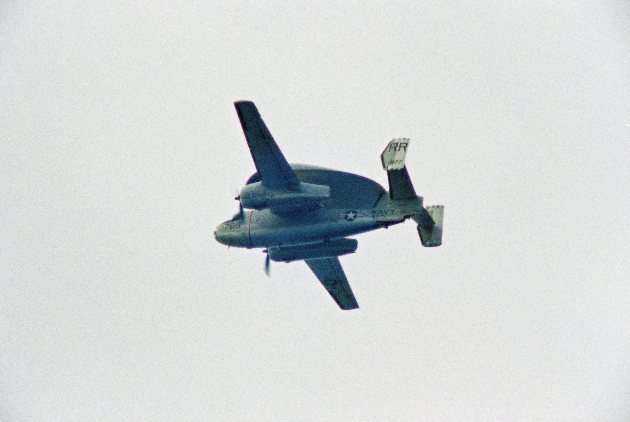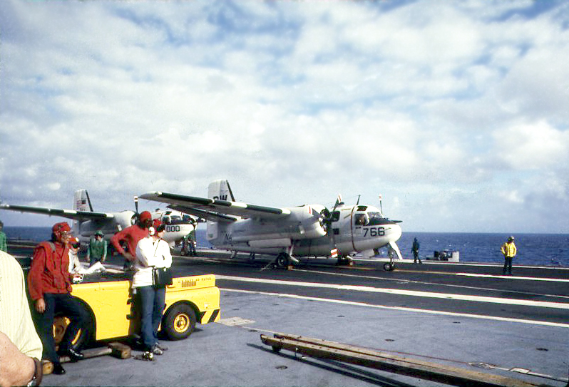 339k | Carrier Airborne Early Warning Squadron (VAW) 111 Det. 12 "Hunters" was called upon to provide four E-1B Tracers, with crews and support personnel, to assist in the recovery of Apollo 11. The E-1Bs were assigned two separate and distinct missions requiring three out of the four aircraft to be airborne simultaneously. One aircraft, "Airboss One," was assigned as Air On-Scene Commander until such time as the PRS, USS Hornet (CVS-12), could assume those duties. In addition, Airboss One provided radar air control of the recovery, swim and photo helicopters during night and IFR recovery operations. A second E-1B, "Relay One," was assigned to relay communications between the PRS, the command module and the recovery aircraft to CTF-130. The third E-1B, "Airboss Two," served as an airborne standby for either of the other two E-1Bs, as well as being able to assist in search operations if needed. (From VAW-111 Det. 12 Ops Summary.) NS-ha-801: One of the Tracers, BuNo 148127, modex RR769, in flight. NS-ha-801a: BuNo 147211, modex RR011, (Airboss ONE?). |