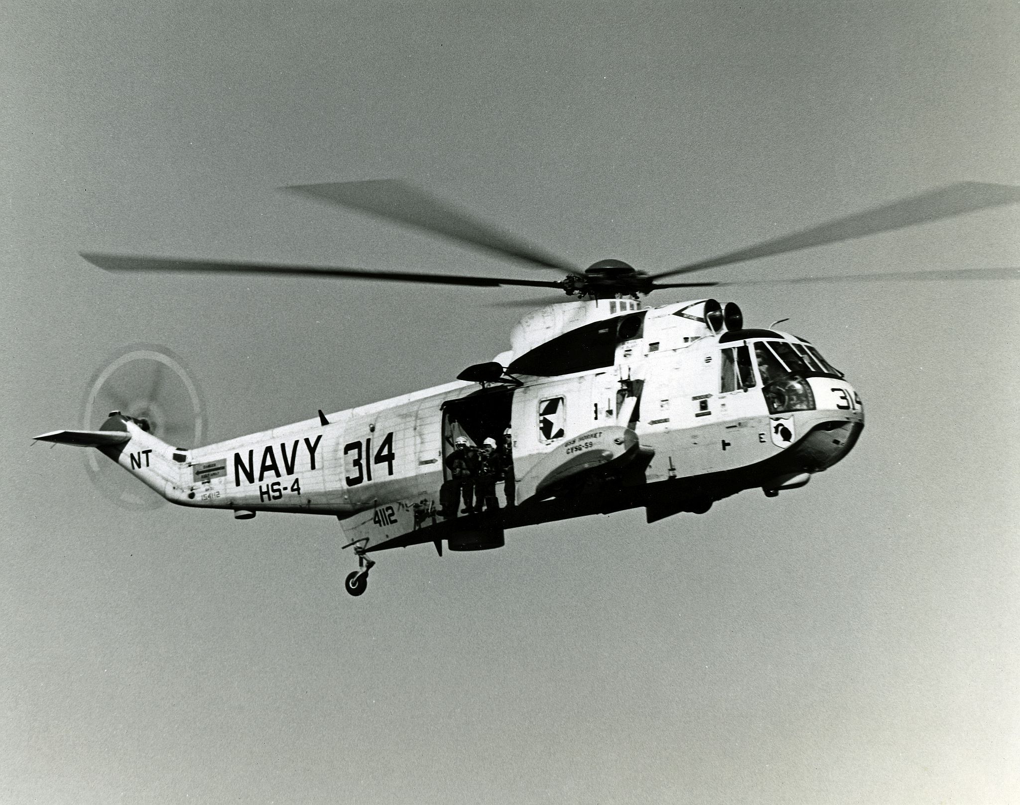586k | SH-3D Sea King helicopter, BuNo 154112, modex NT314, was Swim TWO helicopter for the Apollo 12 recovery mission. It had been the standby helicopter for Apollo 11 (its modex was NT64 at the time). This photo was taken by PHCS Robert Lawson during a SIMEX. |