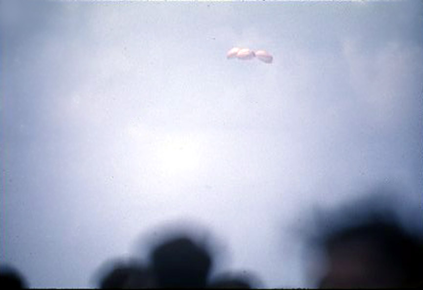 45k | A rare photograph taken by one of Hornet's Photo Lab photographers from the flight deck. The Primary Recovery Ship was so close to the EOM (End Of Mission) point that Yankee Clipper, Apollo 12's Command Module, could be seen and photographed just before splashdown. |
