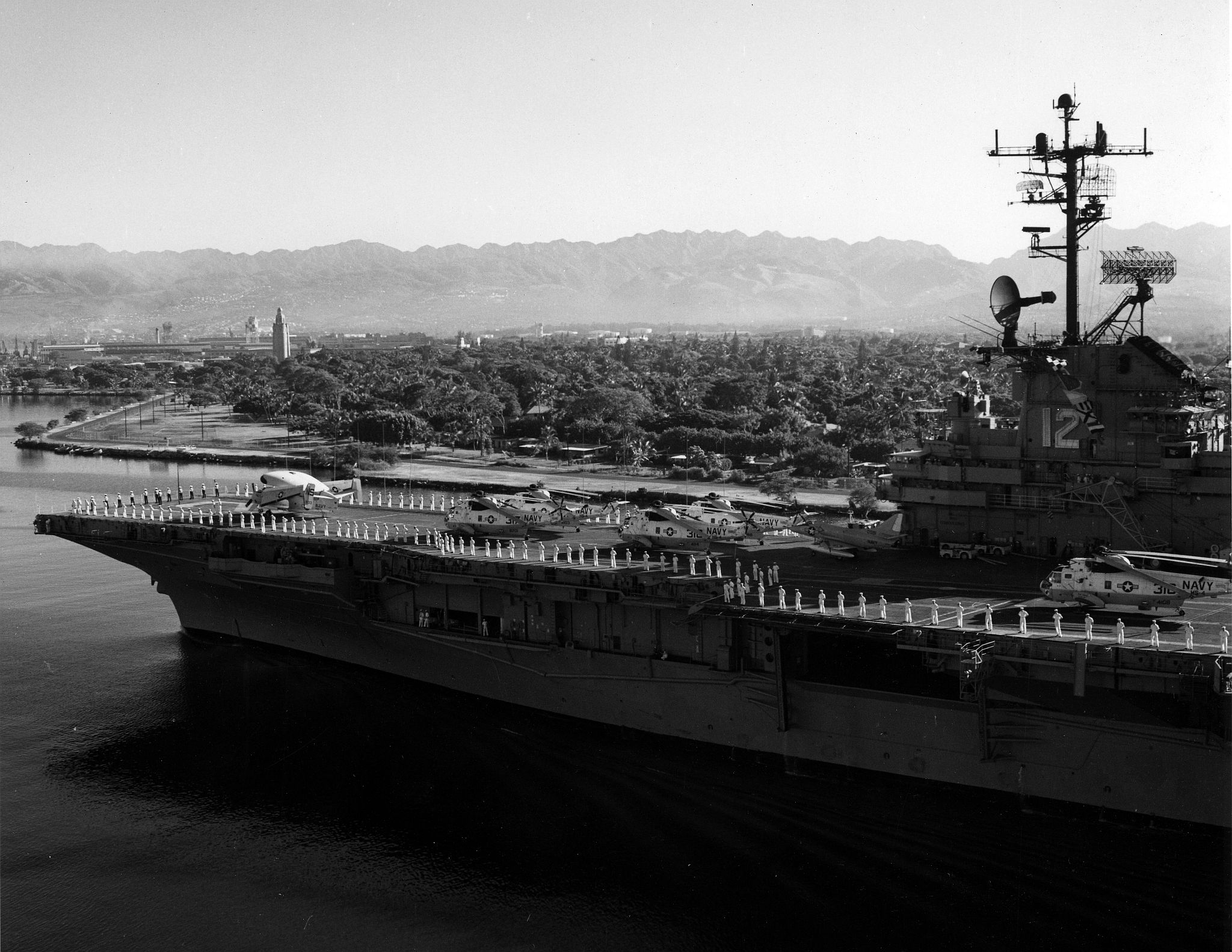 531k | Crewmen man the rails of USS Hornet (CVS-12) as the carrier arrives in port at Pearl Harbor, Hawaii, with the Apollo 12 Command Module and the three astronauts aboard, Friday, 28 November 1969. Naval History & Heritage Command (NH&HC) photo K-80892. |