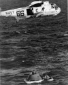 592k | The prime recovery ship for Apollo 12, USS Hornet (CVS-12), maneuvers to recover the Command Module (CM), Yankee Clipper. An SH-3D Sea King helicopter from Helicopter Anti-Submarine Warfare Squadron Four (HS-4) (BuNo 154108, modex NT310), hovers over the CM to support the UDT-13 swimmers on the flotation collar. National Aeronautics and Space Administration (NASA) photo S69-22897. |