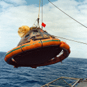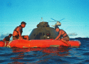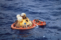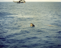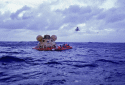 439k | A close-up photo of a SIMEX. After the UDT "practice astronauts" had been hoisted into the recovery helicopter, the UDT swim team that stabilized the spacecraft is now preparing the boiler plate to be recovered. The person in the green Biological Isolation Garment (BIG) suit is the UDT decontamination swimmer, LTJG Clancy Hatleberg. At this moment they are waiting for Hornet to pull nearby and crane the capsule out of the water. US Navy photo. |
