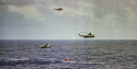 348k | Apollo 12 Primary Recovery Ship USS Hornet (CVS-12) begins a slow approach to recover the Command Module (CM), Yankee Clipper. While the UDT-13 swimmers stand on the CM flotation collar, an HS-4 Sea King helicopter (see below) acts as a navigational beacon for the ship's CO, Captain Carl Seiberlich. US Navy photo by PH3 Ralph G. Howard. |