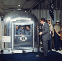 139k | Twenty minutes before the splashdown of Apollo 11, NASA Quarantine Manager John Stonesifer briefed President Nixon, ADM McCain and LCDR Charles B. Larson about the special quarantine equipment designed to provide biological isolation of the astronauts who may be potentially carrying moon germs. They are standing in front of the NASA Mobile Quarantine Facility (MQF). Of note, LCDR Larson was Nixon's Naval Aide at this time and arranged the complex trip to the recovery site. US Navy photo by PHCS Robert Lawson. |