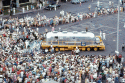 1.44M | After the public welcoming ceremonies at the naval base, the USAF pallet loader, with its MQF and 5 passengers, was part of a tiny motorcade whose destination was Hickam AFB, 2 miles away. Here it is just leaving Pier Bravo and passing through the rear of the naval base as families line the road to wave at the astronauts. US Navy photo. |