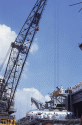 114k | After a SIMEX, all teams involved had to clean, dry and prepare their equipment for the next practice session. In this case, the UDT-11 swimmers have washed their BIG suits and are drying them on an elevator. They are also discussing the results of the SIMEX with a NASA person. Photo by Don Blair. |