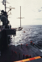 856k | USS Hornet (CVS-12) continues a careful approach to recover the Apollo 12 spacecraft, mindful of wind and drift rates. Note the ship's B&A crane is already extended and prepared for the hoist operation. National Aeronautics and Space Administration (NARA) Photo S69-22882. |