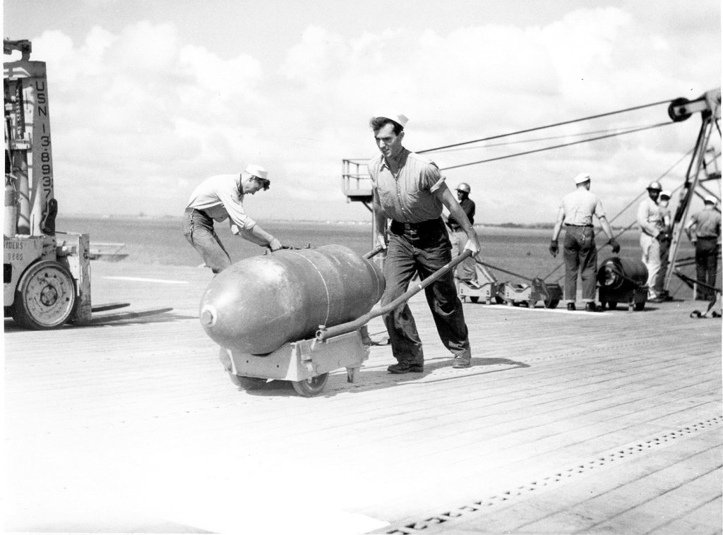 116Kb | Loading a 1,000lb aerial bomb, 1952. Norfolk, Va. |