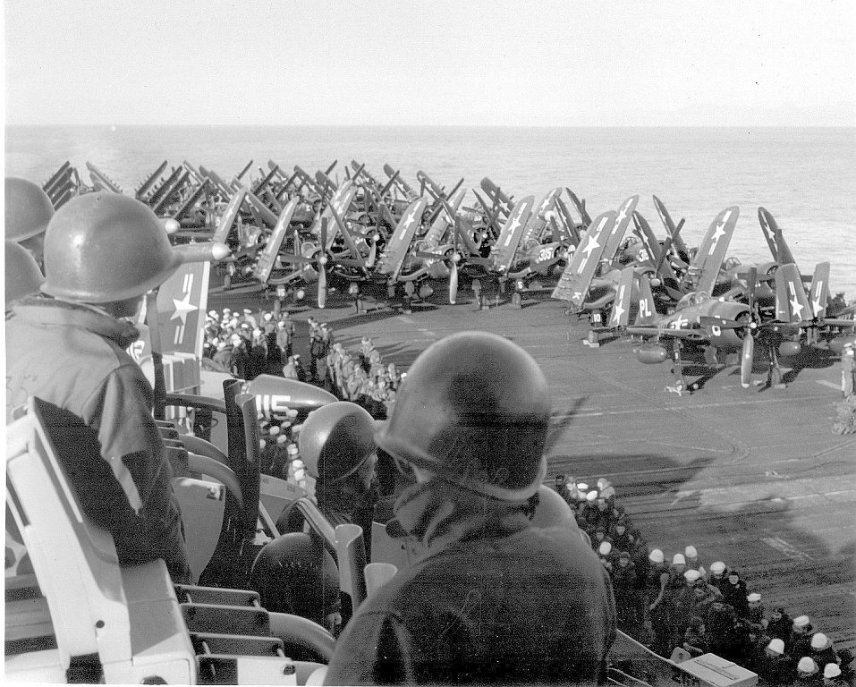212Kb | F4U Corsairs of Carrier Air Group 17 (CVG-17) about to take off. CVG-17 (established as CVG-82 in April 1944, redesignated CVAG-17 in November 1946 and CVG-17 in September 1948) deployed twice with USS Franklin D. Roosevelt in 1951–1952, and never deployed overseas aboard Leyte. |