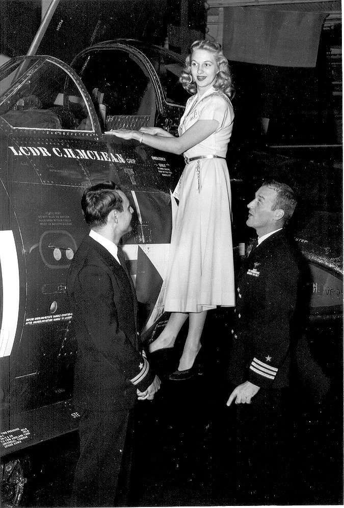 This pilot of an F2H-2 Banshee of VF-34 landed on the wrong ship after an exercise. The next day he came home after a rousing sendoff from the other ship. Latter part of 1952. In all probability the "other" carrier was USS Franklin D. Roosevelt. VF-171 and -172 were the Banshee squadrons aboard FDR at that time. Even Leyte's Air Group 3 tail code ("K") was repainted to look like that of FDR's Air Group 17 ("R".) And if you read the graffiti you'll find references to "Miss FDR" and "FooDeeRoo" (a nickname of Franklin D. Roosevelt). |