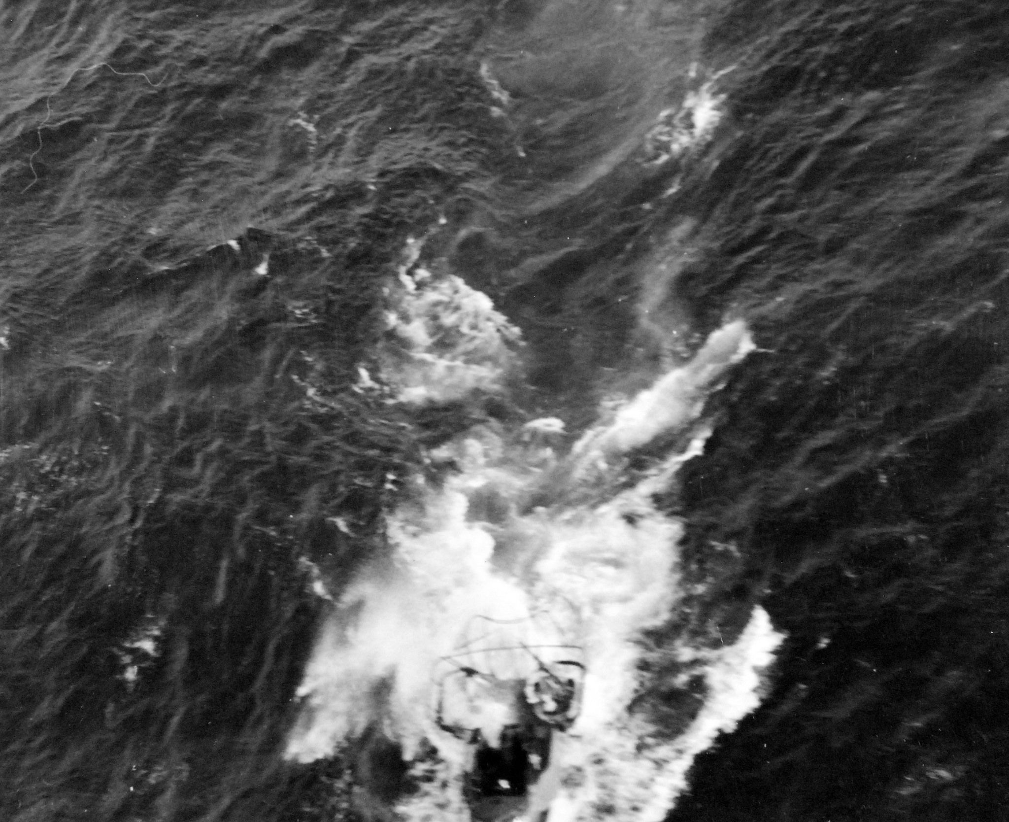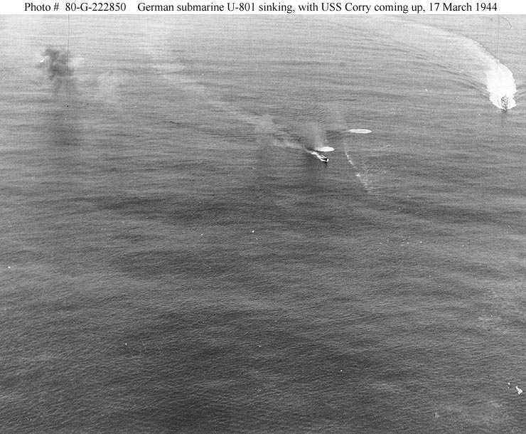 107k | German submarine U-801 sinking with bow high, in position 16 41N, 29 58W on 17 March 1944. USS Corry (DD-463) is coming up at right. The submarine was sunk by aircraft and surface ships of the USS Block Island (CVE-21) group. Photographed from a TBM Avenger aircraft of squadron VC-6, based on Block Island. Official U.S. Navy Photograph, now in the collections of the National Archives (# 80-G-222850). |