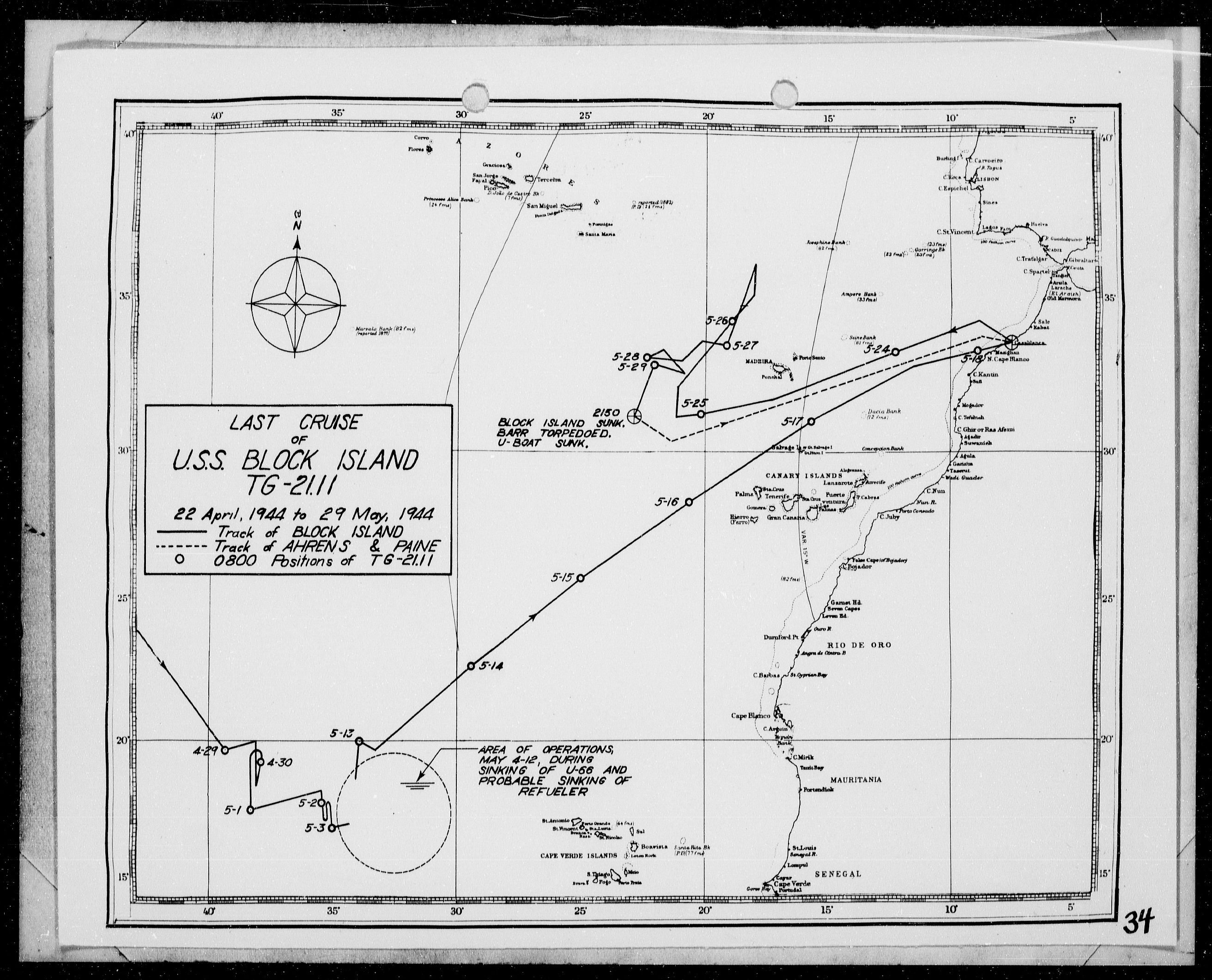 704k | Track of U.S.S. Block Island, from time first torpedo hit to sinking at 2156 (2126 GCT) 29 May 1944. From "Action Report on the Operations Concerning the Loss by Enemy Action of the U.S.S. Block Island on 29 May 1944," Commander Task Group 21.11 (CO USS Block Island) to the Secretary of the Navy. |