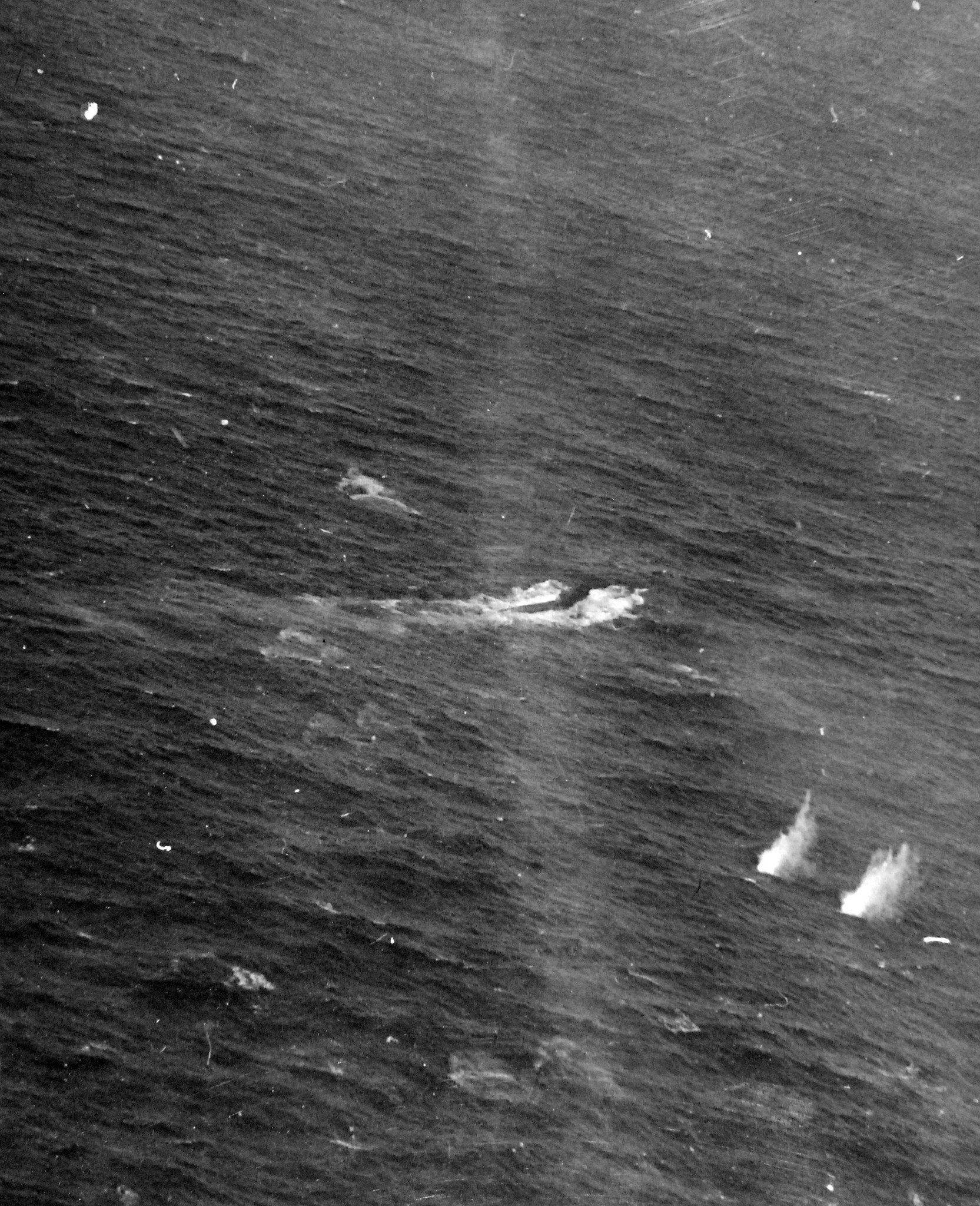 is a little straighter, indicating the forward motion." Note: It is not entirely clear how and when U-220 was sunk. According to the war diary of U-256, it was contacted by U-220 some 30 minutes after the attack, by underwater telephone, to make arrangements for a new meeting point later that day. Moreover, there had been no visible indication that U-220 had been destroyed by Block Island's aircraft. Eight hours later, U-256 saw explosion plumes at the horizon and, subsequently, U-220 did not appear at the agreed meeting point and failed to report its position. U-220 was posted as missing, effective 31 October 1943. (Info from German U-boat Losses During World War II: Details of Destruction, by Axel Niestlé.) |