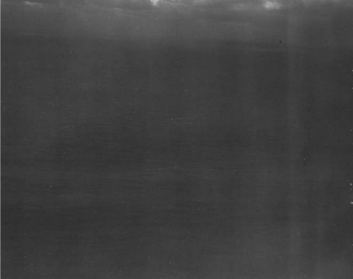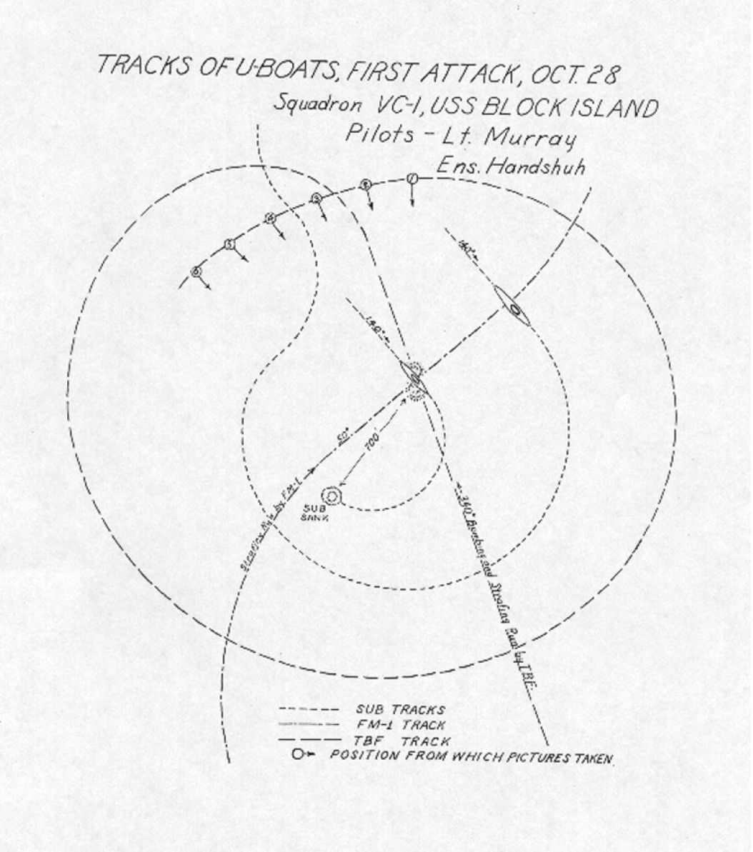 147k | German Type XB submarine U-220 was attacked and sunk by aircraft from Composite Squadron (VC) 1, off USS Block Island (CVE-21), on 28 October 1943. NS0302116: Sketch showing tracks of U-Boats relative to position from which pictures were taken. From VC-1 ASW-6 report 9-43, Enclosure E. "There were six photographs taken of the depth bombing attack and one of the mine attack. The radioman used a K-20 camera to obtain these, the first six being taken out of the port window by the radioman's seat in the TBF tunnel and the seventh from stinger gun position (the [gun] having previously been removed) while lying prone. The negatives from the gun cameras of the fighter and TBF turret are forwarded. The TBF turret film does show the water and some indistinct objects. Obviously the range is great and with the limited facilities aboard ship, nothing of definite value can be found. Perhaps further study of this short strip will disclose further facts." NS0302116a: "U-220 and U-256 under attack by aircraft from USS Block Island, October 28, 1943. U-256 is visible to the left in the photo and U-220 is in the center with DB swirl visible aft of the U-boat. This photo is of poor quality but it is the only one that shows both boats." NS0302116b: "FIDO splash 100 feet beyond the swirl 45 seconds after U-256's conning tower disappeared. The FIDO made a turn to port after it entered the water and disappeared from view. No shock wave was observed." NS0302116c: "To left center can be seen the larger submarine showing what