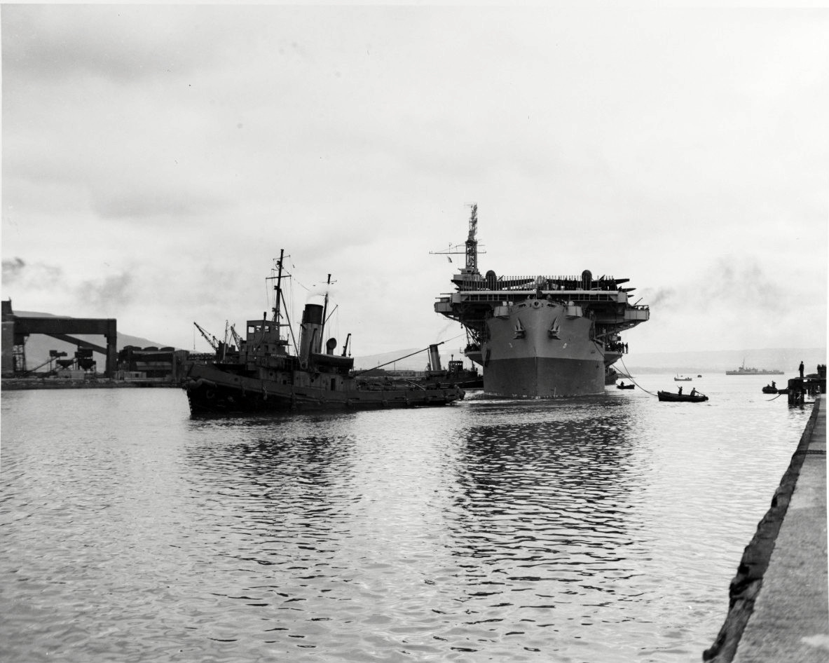 199k | USS Block Island (CVE-21) arrives in Belfast, Ulster, Northern Ireland, with a cargo of Army P-47 Thunderbolt fighters. She was unloaded in a record 14 hours. The tug Empire Meadow is off her bow, guiding her to her berth. The photo is dated 7 September 1943, but was probably taken a week earlier, on 31 August (on the given date, Block Island was steaming in the North Atlantic). National Archives and Records Administration (NARA), photo # 80-G-55525. |