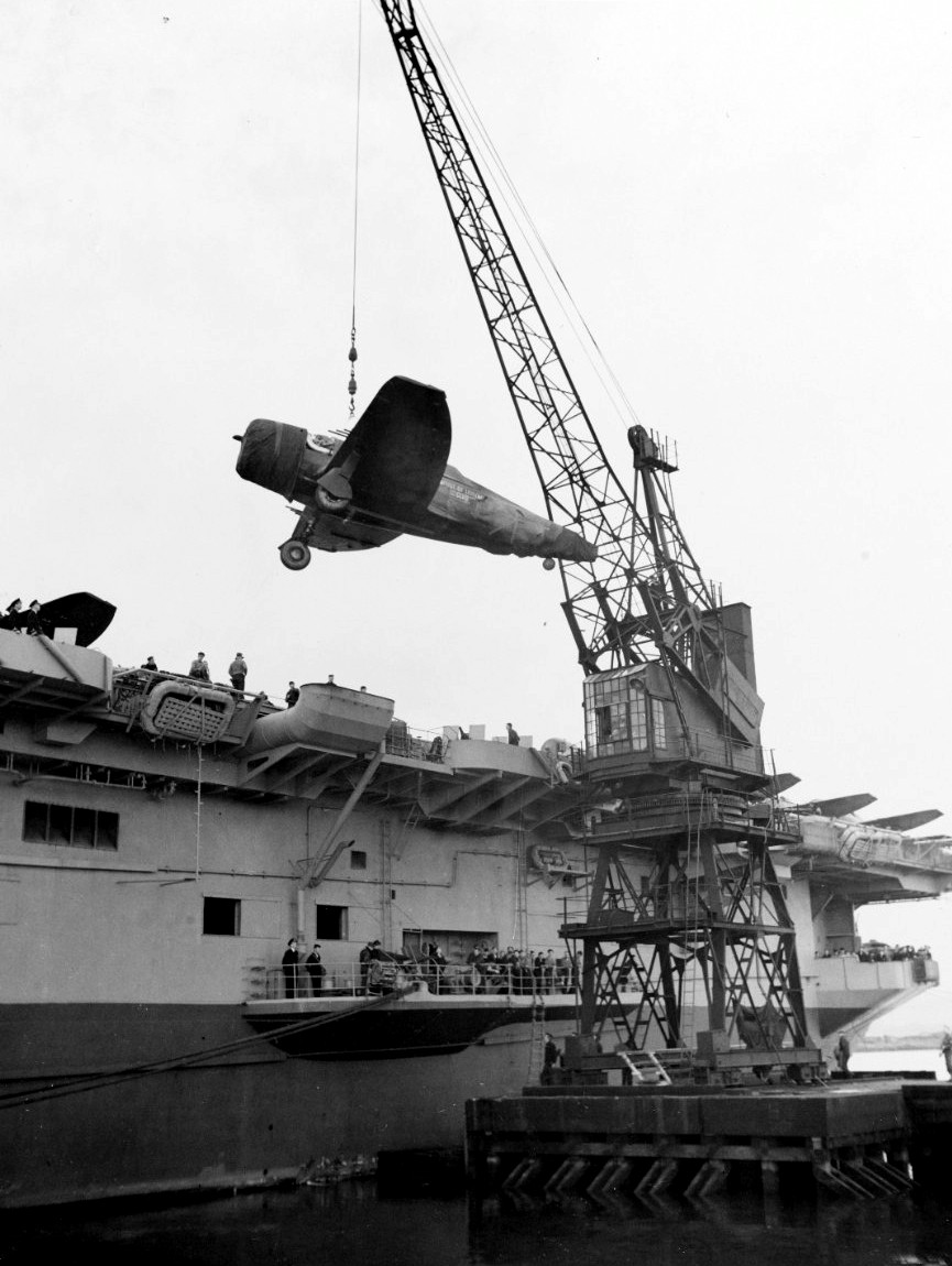 691k | Unloading P-47 Thunderbolts from USS Block Island (CVE-21) at Belfast, Northern Ireland, 27 July 1943. National Archives and Records Administration (NARA), photo # 80-G-77757. |