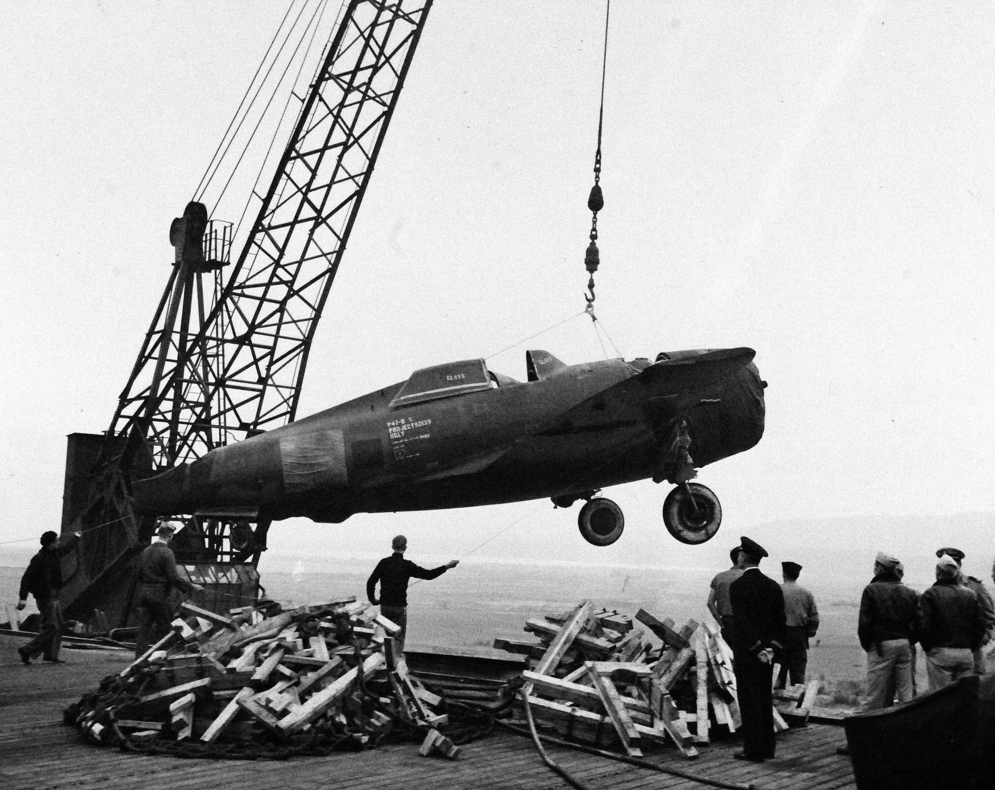 691k | Unloading P-47 Thunderbolts from USS Block Island (CVE-21) at Belfast, Northern Ireland, 27 July 1943. This image captures the hoisting of a plane from the flight deck. This is a P-47D-5 variant, of which 300 were built. They were fitted with a GE C-21 supercharger and water injection as well as improved B-7 bomb/drop tank shackles. National Archives and Records Administration (NARA), photo # 80-G-77760. |