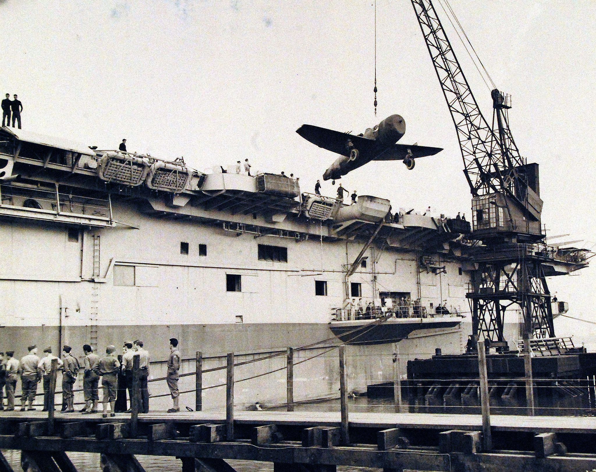 1.03M | Unloading P-47 Thunderbolts from USS Block Island (CVE-21) at Belfast, Northern Ireland, 27 July 1943. This image captures the hoisting of a plane from the flight deck. Block Island was moored port side to Air Drome Dock. National Archives and Records Administration (NARA), photo # 80-G-77763. |
