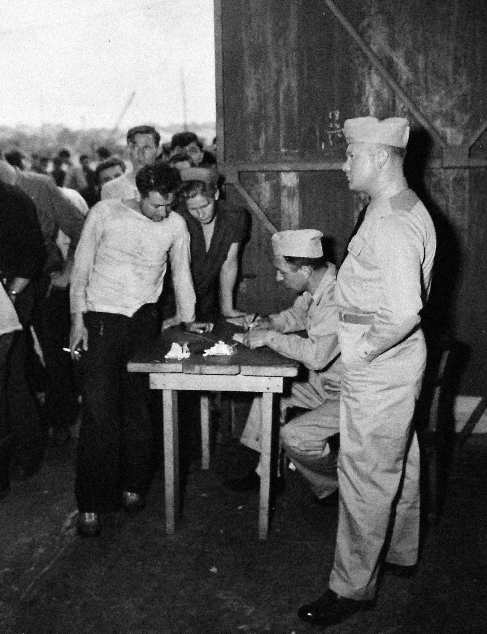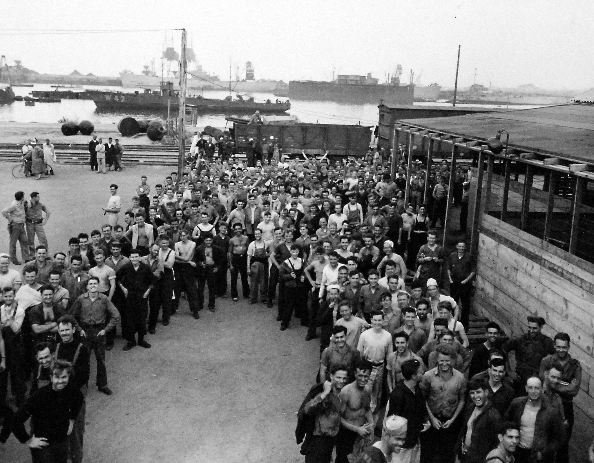 558k | Survivors of USS Block Island (CVE-21), Casablanca, Morocco. Crew. Photographed by L.F. Cirzan (USS Bogue (CVE-9)), 1 June 1944. Official U.S. Navy Photograph, now in the collections of the National Archives and Records Administration (NARA), # 80-G-266510. |