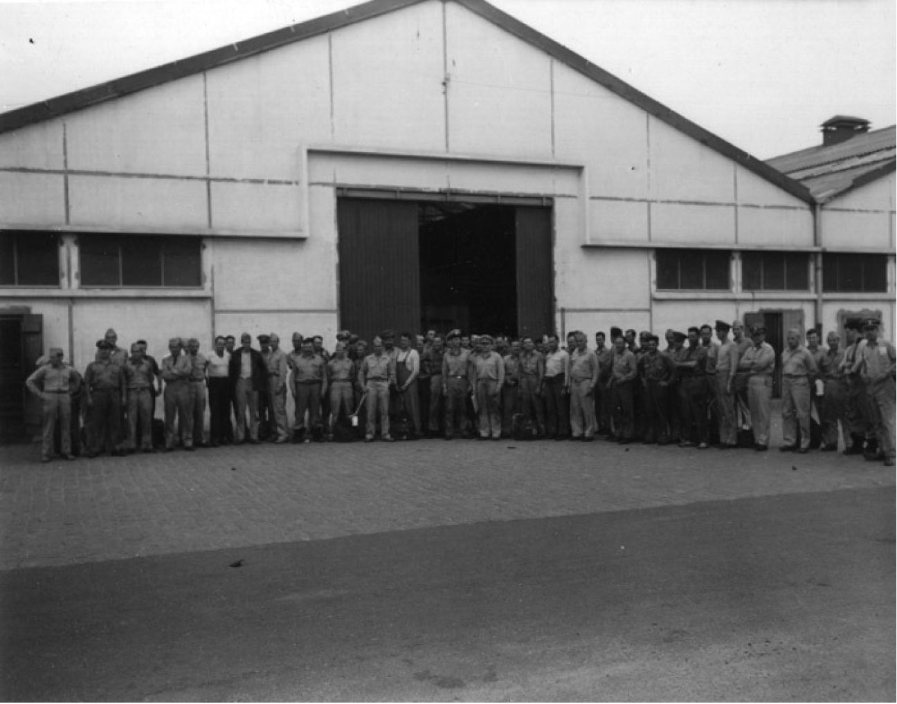711k | Assembling P-47s at Sydenham Airport, Belfast, North Ireland. Last "touch-up" before test flight. Part of USS Block Island (CVE-21) can be seen in the background, 31 July 1943. National Archives and Records Administration (NARA), photo # 80-G-77769. |