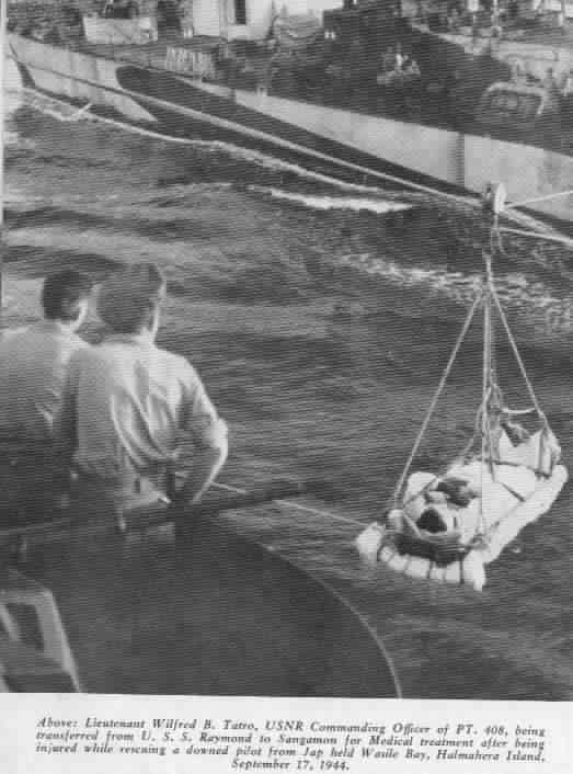 29k | LT Wilfred B. Tatro, USNR Commanding Officer of PT-489, being transferred from USS Richard M. Rowell (DE-403) for medical treatment after being injured while rescuing a downed pilot from Jap held Wasile Bay, Halmahera Island, September 17, 1944. Note: caption typed below photo identifies the DE as USS Raymond (DE-341). Sangamon's log, however, clearly states she was actually Richard M. Rowell. Don Schroeder recalls: "When they brought LT Tatro aboard he had a small wrench partially imbedded in his forehead. The story was that the wrench was laying on the upper deck and when they accelerated the PT boat it flew into his forehead. We had a surgeon aboard so they brought him to us." |