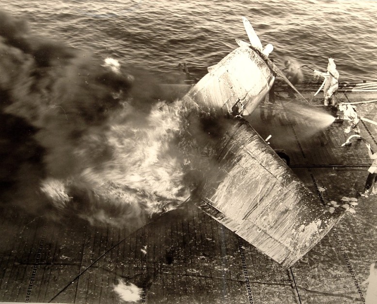 46k | Fire crews at work after flaming deck crash; February 22, 1943. | Don Schroeder | |