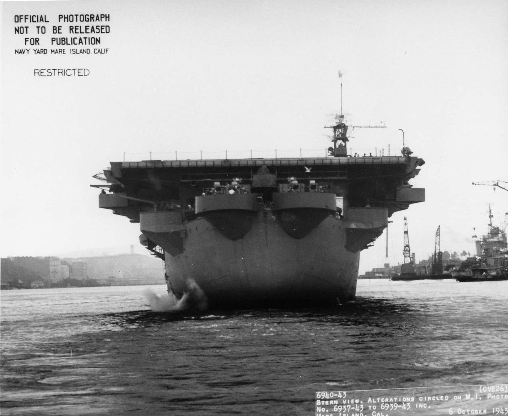 683k | Stern view of USS Sangamon (CVE-26) at Mare Island Navy Yard on 5 Oct 1943. She was in overhaul at the yard from 5 Sep until 6 Oct 1943. Official photo, MINY # 6940-43. | Darryl Baker | |