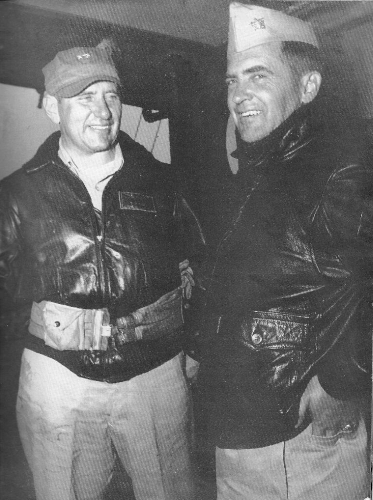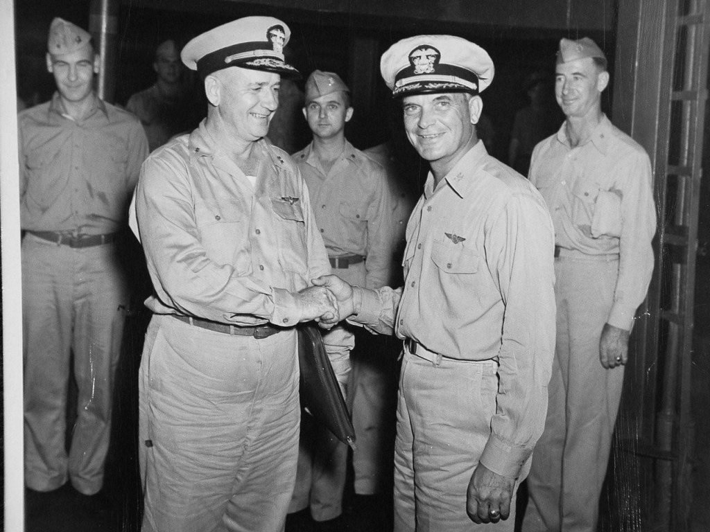 144k | "Admiral V.H. Ragsdale shaking hands with Captain M.E. Browder upon departure from ship after being relieved as Com Car Div 22." (See "Flag Admirals & Commanding Officers"). |