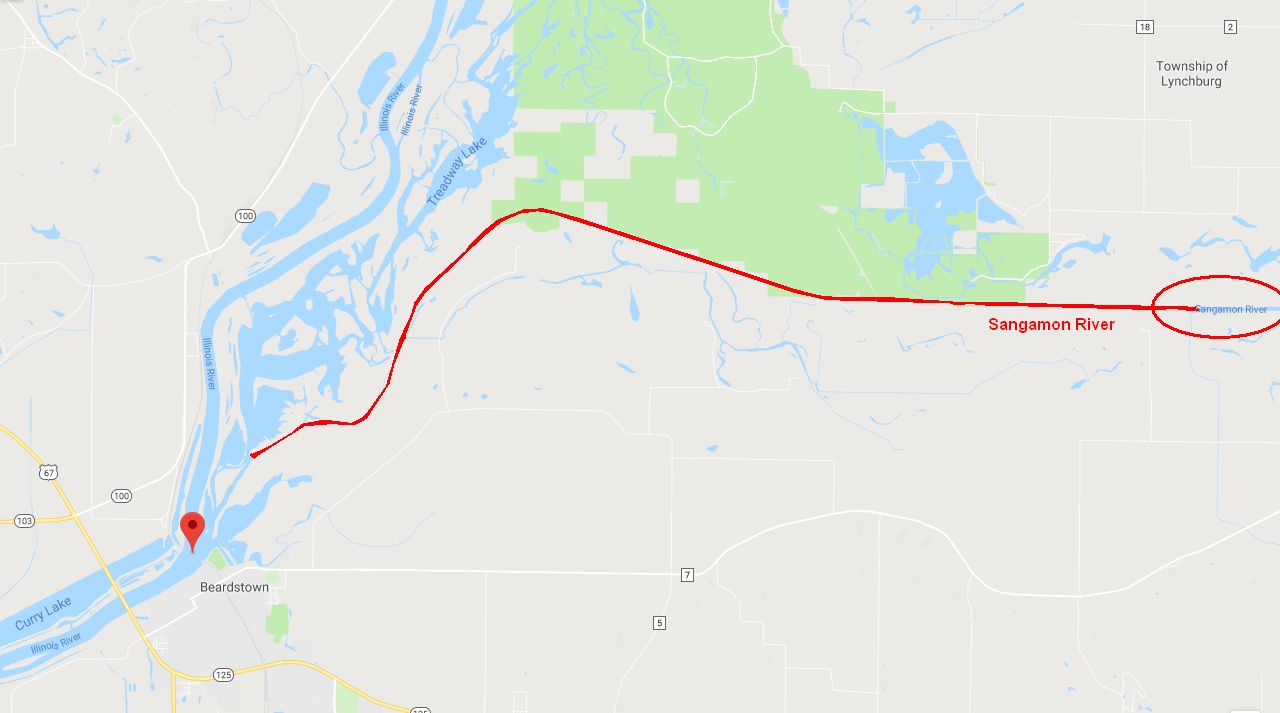 65k | AO-28 (later AVG-26, ACV-26 and CVE-26) was named Sangamon for a river in central Illinois, approximately 246 miles (396 km) long and a principal tributary of the Illinois River (NS0302635). The Sangamon River is associated with the early career of Abraham Lincoln and played an important role in the early white settlement of Illinois. A Civil War monitor had previously borne the name. NS0302635a: Sangamon River at Lincoln Trail Homestead State Memorial, near Lincoln's first home in Illinois. (Map NS0302635 courtesy of Google Maps. Photo NS0302635a by "Dual Freq," courtesy of its author and Wikipedia.) |