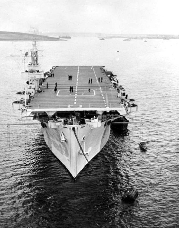166k | HMS Queen (D19), ex-St. Andrews (CVE-49), tied up to a mooring buoy at Scapa Flow, Orkney Islands, Scotland, May 1945. Photo taken by an unknown Royal Navy official photographer. Imperial War Museums. Photo No:A 29177. |