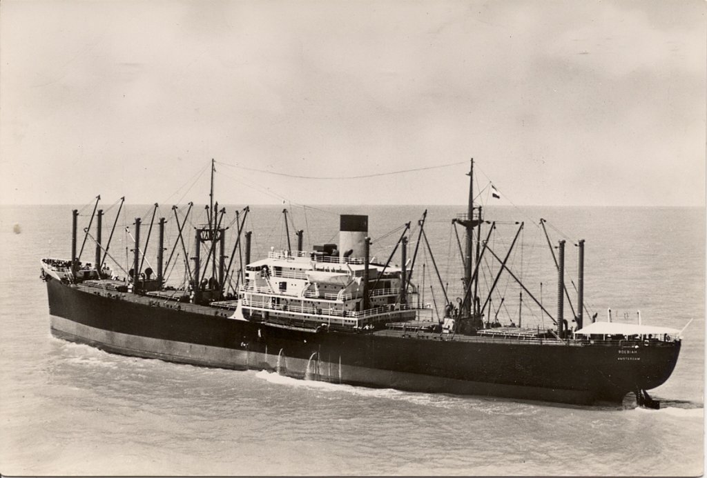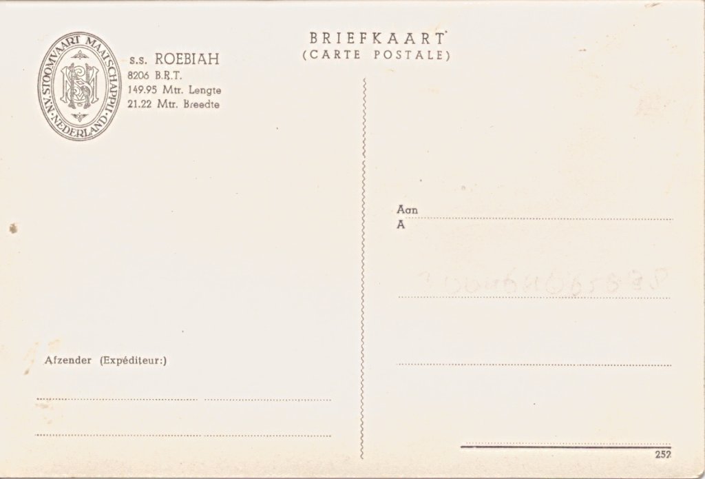 110k | Ex-St. Andrews (CVE-49), ex-HMS Queen (D19), as SS Roebiah (Dutch flag). Undated postcard. |