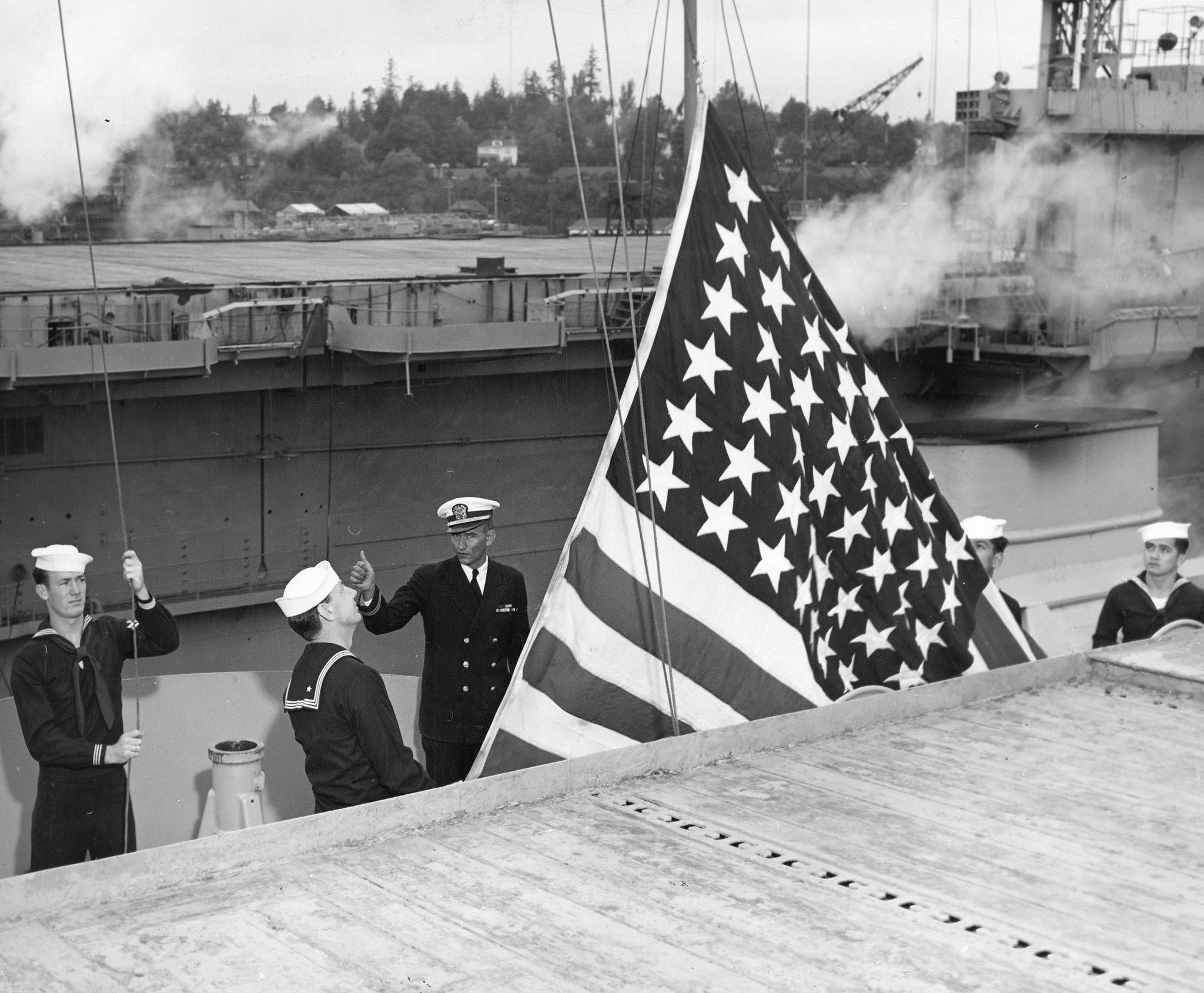 455k | USS Cape Esperance (CVE-88) raising the flag as the ship is recommissioned for Korean War service, at the Puget Sound Naval Shipyard, 5 August 1950. Members of the color detail are (from left to right): Quartermaster First Class Howard L. Foley, USNR; Seaman Bobby G. Young, USN; Lieutenant (Junior Grade) Alva L. Dixon, USN; Seaman Apprentice Raymond E. Garcia, USN; and Seaman Cesar C. Abrajano, USN. Official U.S. Navy Photograph, from the All Hands collection at the Naval History & Heritage Command (NH&HC), # NH 97005. |