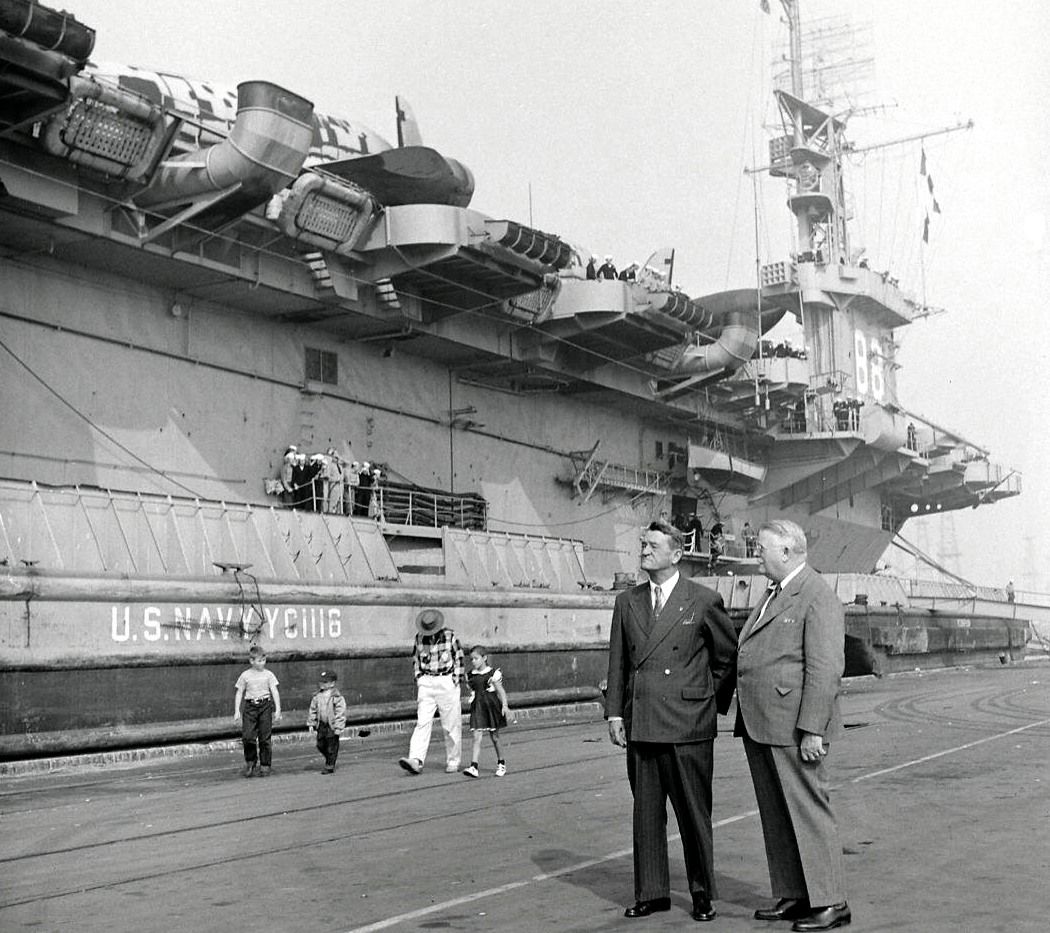 171k | YC-1116 and another unidentified YC alongside escort carrier Cape Esperance, location unknown, 1952. General Claire Lee Chennault and an unidentified associate are observing the docking of the carrier and SS Sea Dragon with their load of former CATC C-46 and Convair CV-240-14 aircraft. Photo from Archives, Loomis Dean photographer. |