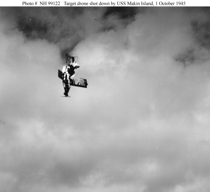 34k | Small Target Drone Aircraft falling in flames, after being shot down by USS Makin Island (CVE-93) during gunnery practice off Wakanoura Wan, Wakayama, Japan, 1 October 1945. Collection of Rear Admiral Calvin T. Durgin, USN, donated by his Daughter, Mrs. Phyllis Sherrill, 1972. Official U.S. Navy Photograph, from the collections of the Naval Historical Center (# NH 99121). |