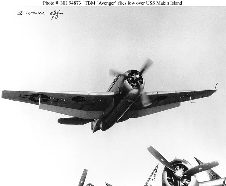 50k | TBM-1 Avenger torpedo plane flies low over the flight deck of USS Makin Island (CVE-93), circa 1944-1945. Courtesy of PHC John Highfill, USN (Retired). U.S. Naval Historical Center Photograph (# NH 94873). |