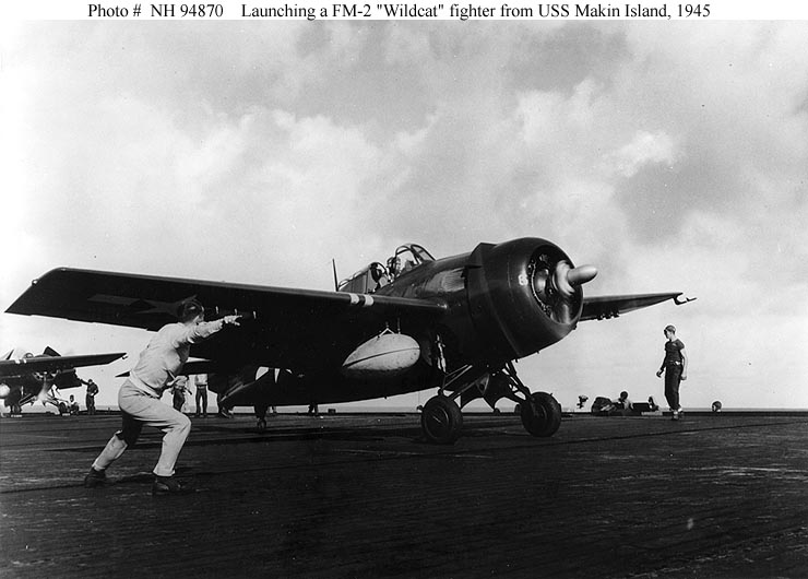 61k | FM-2 Wildcat fighter receives the "launch" signal on USS Makin Island (CVE-93), 1945. Courtesy of PHC John Highfill, USN (Retired). U.S. Naval Historical Center Photograph (# NH 94870). |
