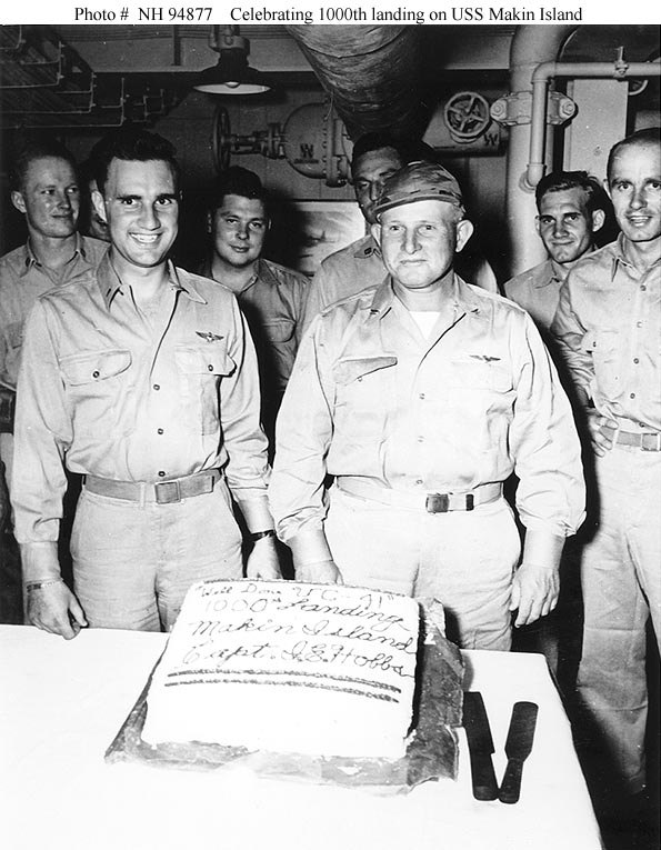94k | Captain Ira E. Hobbs (right center), ship's Commanding Officer, joins aviators of Composite Squadron 41 (VC-41) in celebrating their 1000th landing on board, circa mid-1945. Courtesy of PHC John Highfill, USN (Retired). U.S. Naval Historical Center Photograph (# NH 94877). |