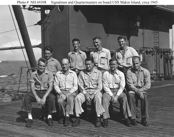 112k | Ship's Signalmen and Quartermasters pose on her flight deck, circa 1945. Present are: Seated, left to right: QM1c F.L. Thorpe; Chief Signalman C.J. Spaulding; Lieutenant (Junior Grade) Roland C. Beale, USN; Chief Quartermaster F.J. Fallis; and SM1c G.R. Yohnka. Standing, left to right: SM3c E.F. Szenci; SM2c W.K. Jordan; SM2c W.H. Bowman; and SM3c D.W. Cumming. Collection of Vice Admiral Calvin T. Durgin. Donated by his daughter, Mrs. Phyllis Durgin Sherrill, 1969. Official U.S. Navy Photograph, from the collections of the Naval History & Heritage Command (NH&HC), # NH 69398. |