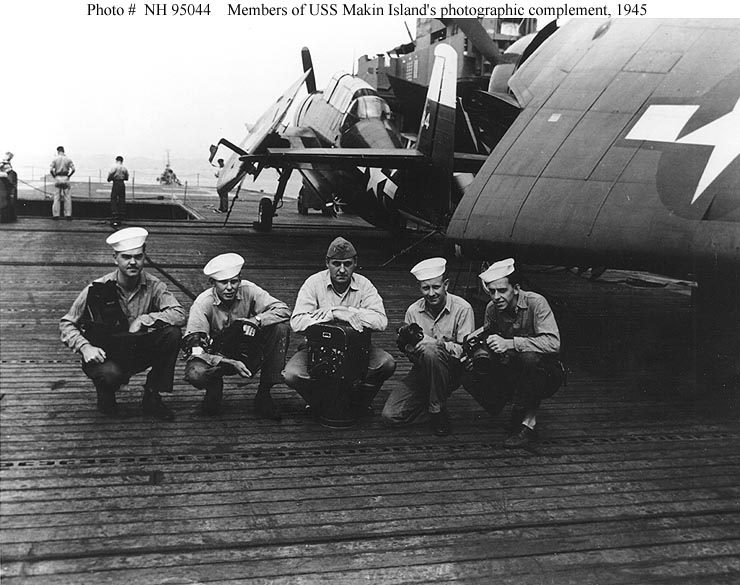 94k | Members of the ship's photographic complement pose with different types of cameras, 1945. Those present are (from left to right): McIntosh, Hougon, Lieutenant (Junior Grade) John L. Highfill, Cook and Reed. Note TBM Avenger aircraft parked on the carrier's flight deck. Courtesy of PHC John L. Highfill, USN (Retired). U.S. Naval Historical Center Photograph. (# NH 95044). |