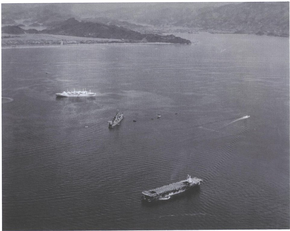 112k | USS Makin Island (CVE-93) in Wakanoura Wan, Wakayama, Japan evacuating allied war prisoners, September 1945. Also visible in this photo are: (top) a Haven-class hospital ship, probably USS Sanctuary (AH-17), or perhaps USS Consolation (AH-15); and (center) a Cleveland-class light cruiser, possibly USS Montpelier (CL-57). (See also photo NS0309308.) Collection of LT J.W. Glock, who served as LSO aboard Makin Island, 1944–1945. |