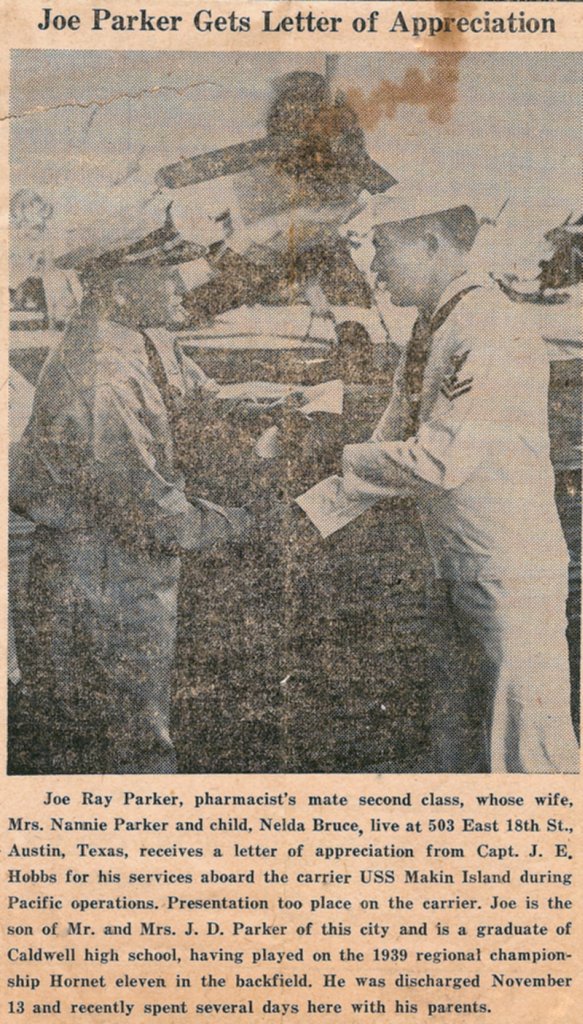 188k | Joe Ray Parker, Pharmacist's Mate 2/c, receives a Letter of Appreciation from CAPT Ira E. Hobbs, ship's commanding officer, for his services aboard the carrier USS Makin Island (CVE-93) during Pacific operations. |