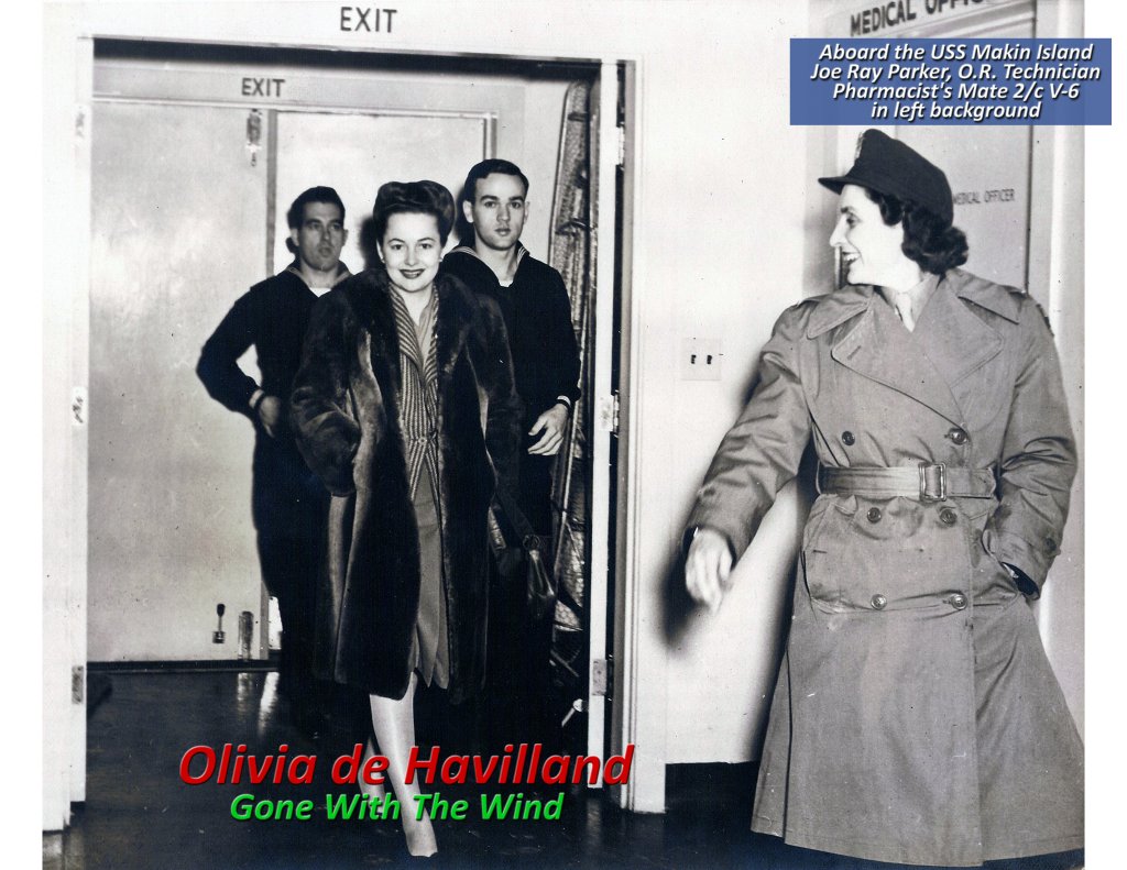 151k | Actress Olivia de Havilland ("Wings of the Navy," "Gone with the Wind," "To Each His Own," "The Heiress") aboard USS Makin Island (CVE-93). Joe Ray Parker in left background. |