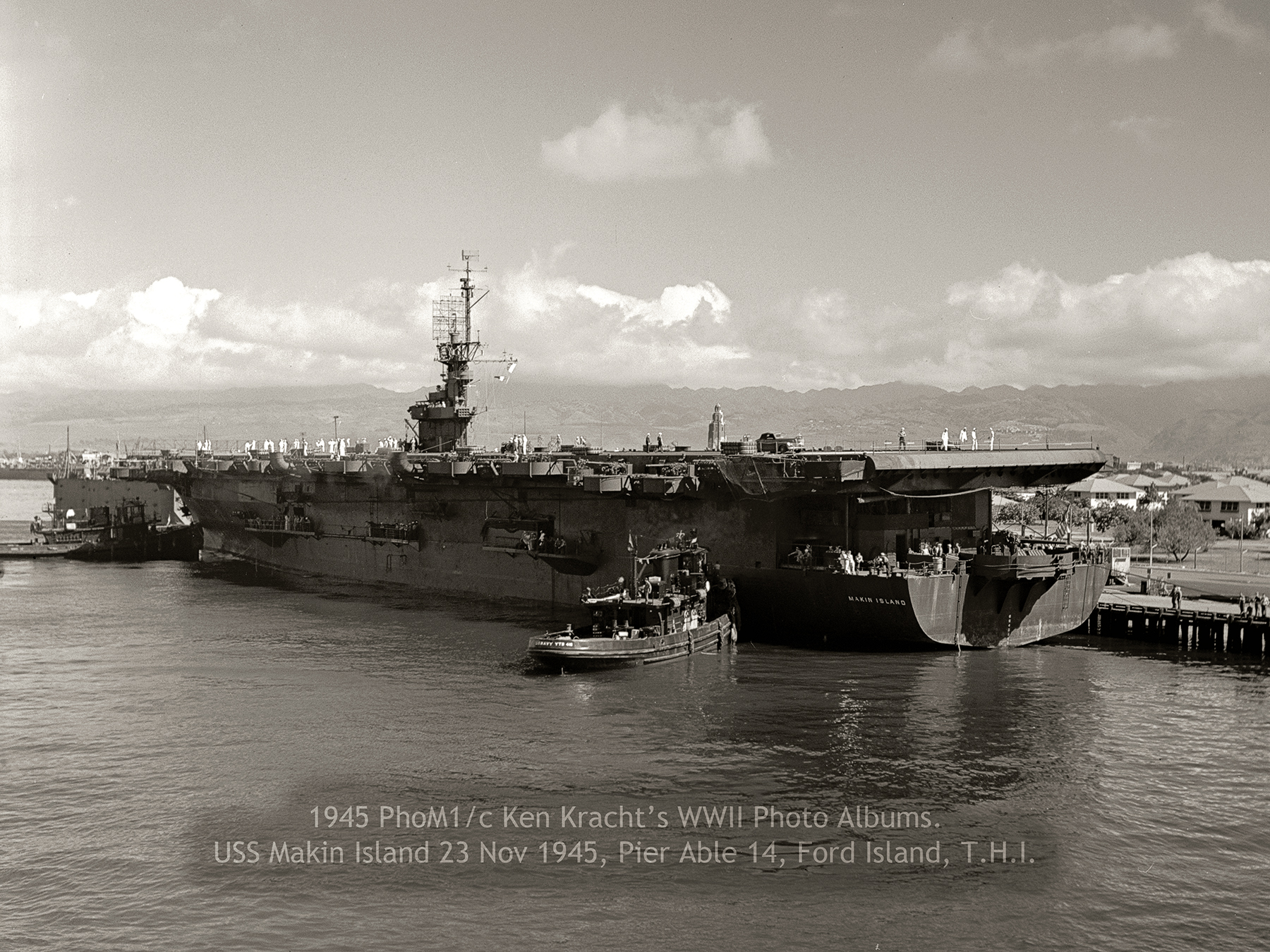 1.65M | "USS Makin Island (CVE-93) in Pearl Harbor, 23 November 1945. Looking north-northeast from the north end of Ford Island. Original photo by PhoM1/c Ken Kracht. Restored from the original 6x6cm negative—spotted, cropped, toned, and enhanced for Navsource [by Carl Kracht]. Near as I can figure from War Diaries and other photos taken in Pearl while USS Rocky Mount (AGC-3) was there, this photo was taken around 11 AM as Rocky Mount sailed past Makin Island. Rocky Mount steamed up the west side of Ford Island past USS Makin Island at the northern tip, then around the north end of the island and moored at about the position of the current USS Arizona Monument. The bridge wasn't there in 1945." "From COM 14 War Diary for Nov 1945:"