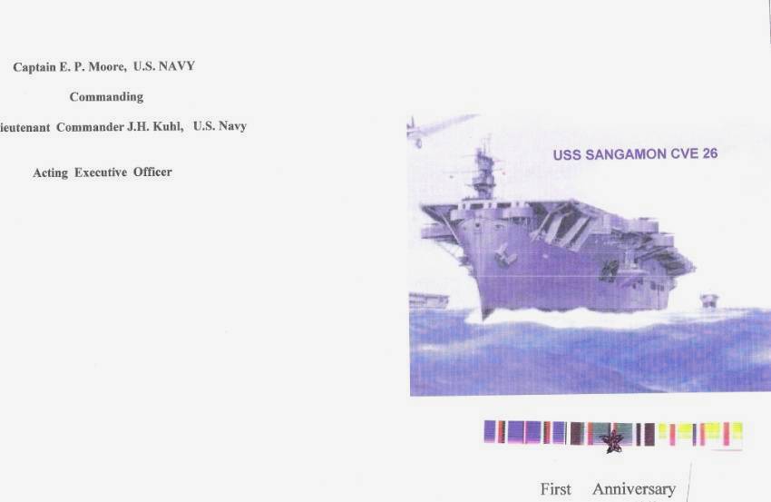 30k | First Anniversary Menu, August 25th, 1943. Sangamon was en route to Mare Island Naval Base in California after duty in the South Pacific. Submitted by Hank Millan. |