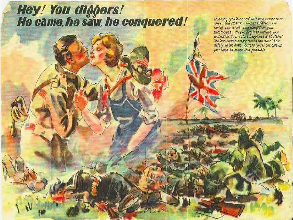 187k | "Hey! You diggers! He came, he saw, he conquered!" "Thinking you 'diggers' will never come back alive, the BLACKS and the YANKS are raping your wives, your daughters, your sweethearts — they are helpless without your protection. Your future happiness is at stake! One less Aussie simply means one more Yank 'safely' in the home. Surely you'll not give up your lives to make this possible." Submitted by Hank Millan. This leaflet was given to Hank by a Marine on Manus Island. |