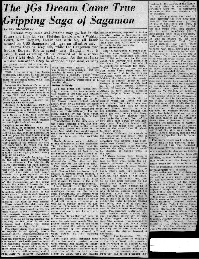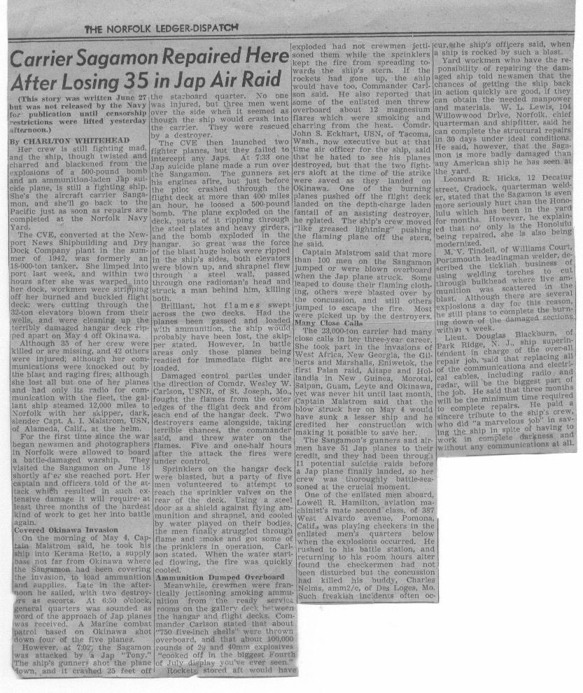 "Carrier Sangamon Repaired Here After Losing 35 in Jap Air Raid." The Norfolk Ledger-Dispatch.