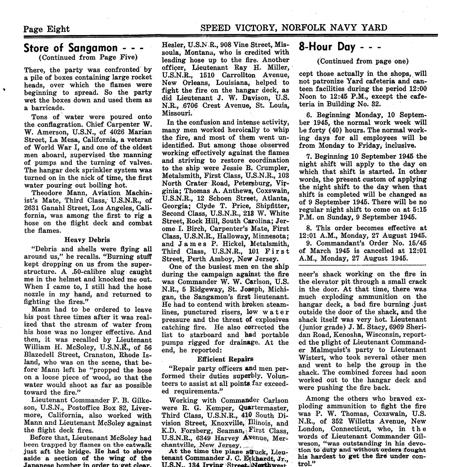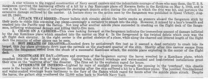 "Story of Aircraft Carrier Sangamon Is Now Revealed" Speed Victory - Norfolk Navy Yard. August 23, 1945. Page 8.