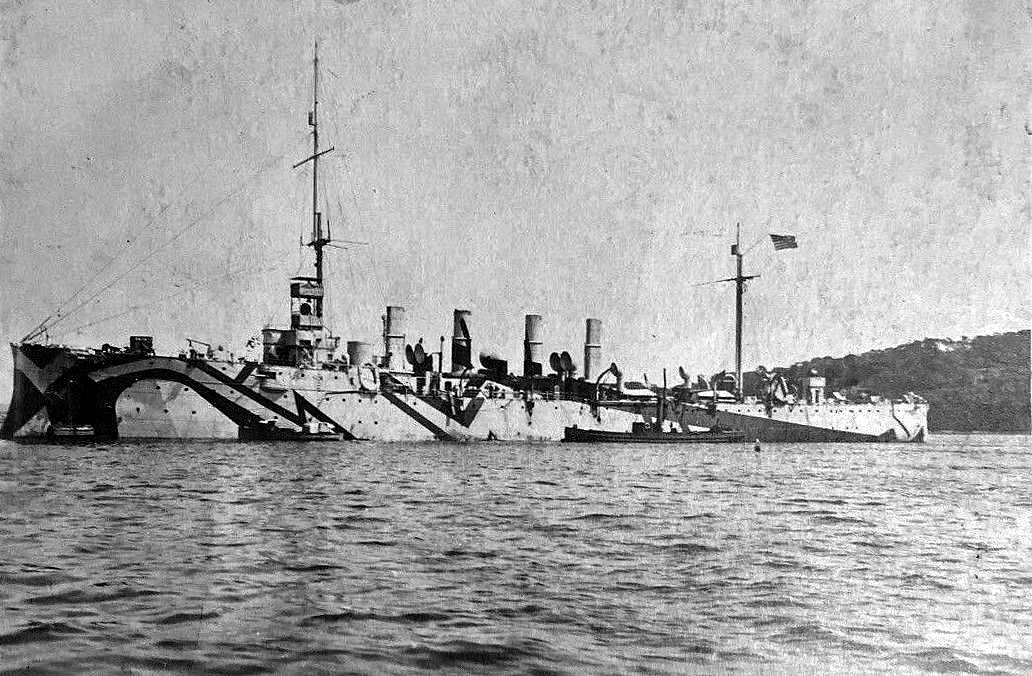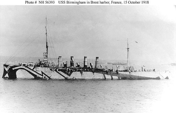 Birmingham (CS-2) In Brest harbor, France, on 15 October 1918. During 1917-1918 she was flagship of U.S. Forces at Gibraltar and escorted convoys in the eastern Atlantic. Note her "dazzle" camouflage. Courtesy of John G. Krieger, 1966-1967. U.S. Naval Historical Center Photograph #NH 56393. |