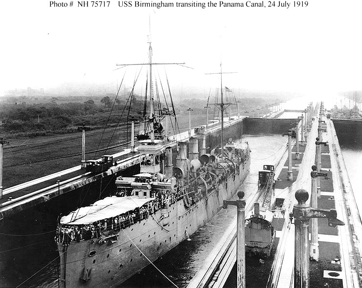 Birmingham (CS-2) In the Middle West Chamber, Gatun Locks, during the passage of the Pacific Fleet through the Panama Canal, 24 July 1919. Courtesy of the Naval Historical Foundation, Washington, D.C. Collection of Admiral William V. Pratt. U.S. Naval Historical Center Photograph #NH 75717. |